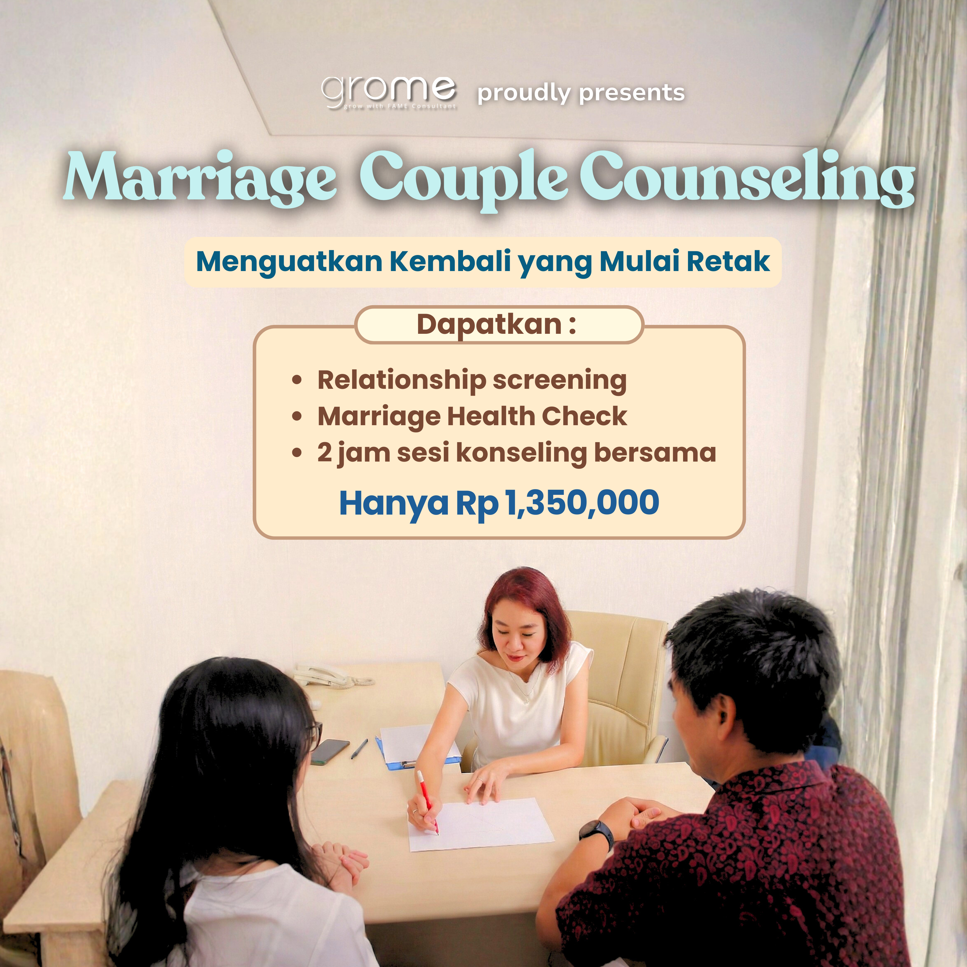 Pada akhirnya, baikan dengan pasangan bukan tentang siapa yang paling benar, tetapi tentang siapa yang bersedia untuk kembali terhubung. Dalam beberapa situasi, proses ini tidak selalu mudah dilakukan sendiri. Marriage counseling maupun dating counseling yang dihadirkan oleh grome.id dapat menjadi ruang yang aman bagi para pasangan untuk memahami dinamika hubungan secara lebih dalam, mengelola konflik dengan lebih sehat, serta membangun kembali koneksi emosional yang sempat terputus.